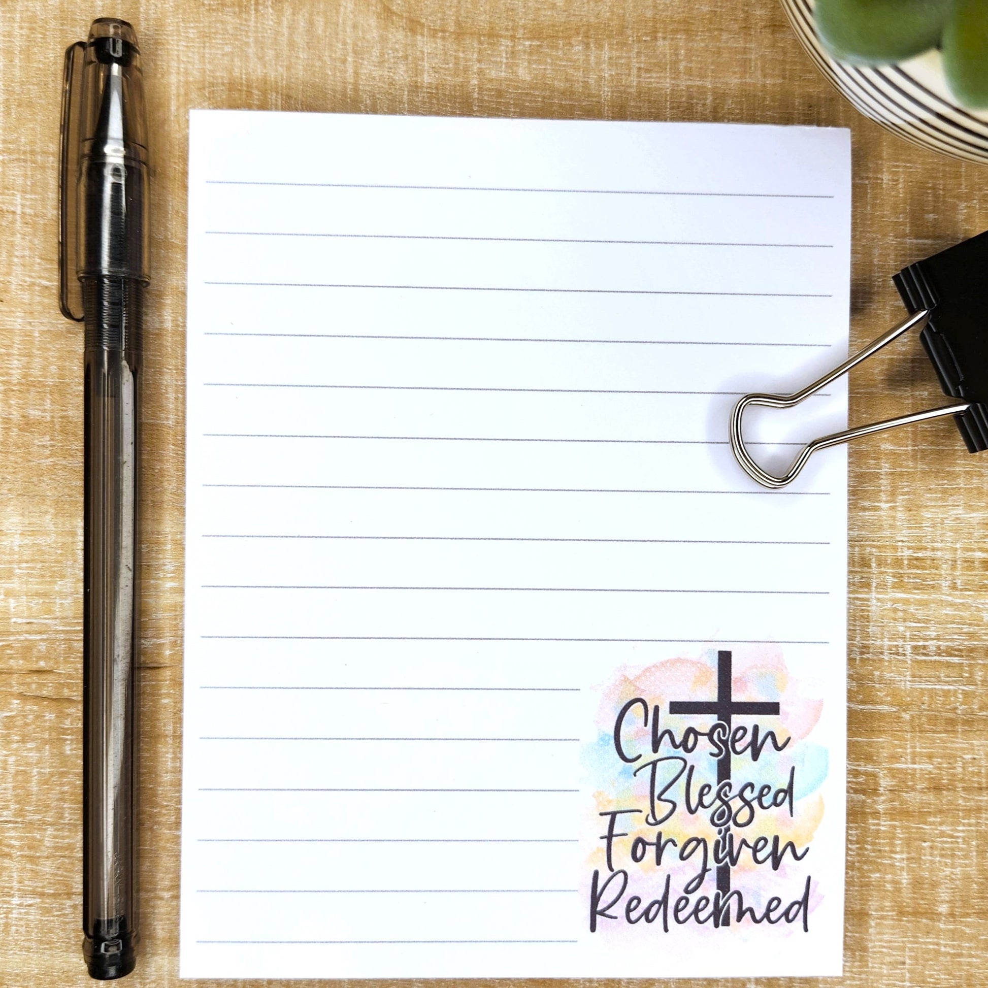 Capture your thoughts and divine inspiration in this Chosen Blessed Forgiven Redeemed notepad! It's the perfect way to jot down everything from sermon notes to your daily musings with a faith-filled twist. Plus, its ecofriendly design ensures that you won't have to answer to your Maker for pollution!